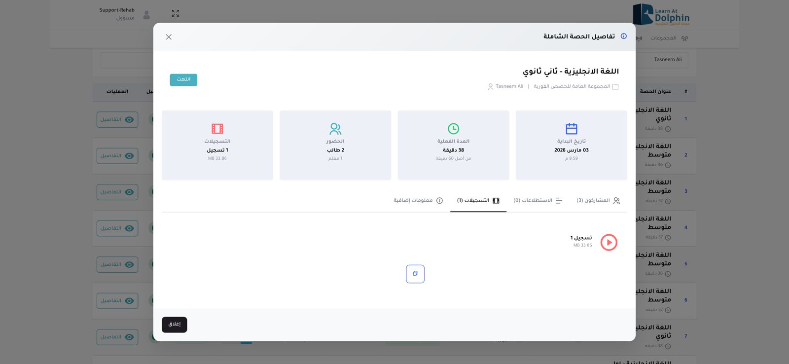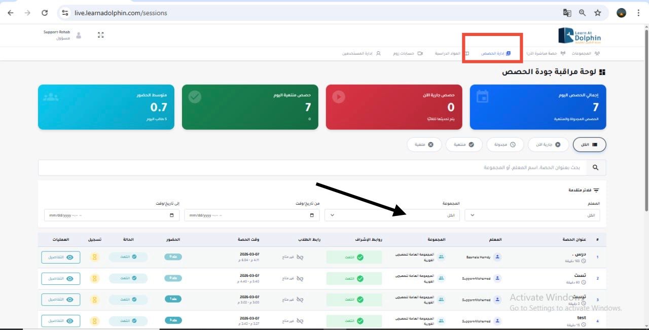 • يعرض ملخصًا سريعًا للحصص المنعقدة اليوم. • يوضح عدد الحصص الجارية، المنتهية، ومتوسط الحضور. • يتيح البحث عن حصة باستخدام عنوان الحصة أو اسم المعلم أو المجموعة. • يعرض تفاصيل الحصة مثل وقت الحصة والمعلم والمجموعة. • يوضح حالة الحصة (جارية – منتهية – لم تبدأ). • يتيح عرض مزيد من التفاصيل عن الحصة عند الحاجة • يساعد علي الوصول إلى روابط الجلسة • متابعة حضور الطلاب يعرض نسبة أو عدد حضور الطلاب في كل حصة • إمكانية البحث يمكنك البحث عن حصة محددة باستخدام عنوان الحصة أو اسم المعلم أو اسم المجموعة • يمكن الحصول علي الحصة المسجله من خلاله و عمل جلب لأي تسجيل غير ظاهر