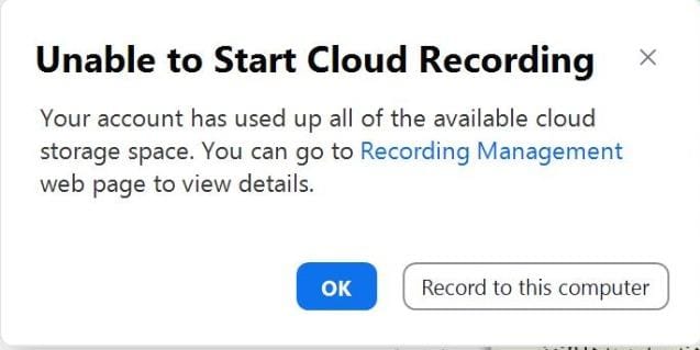 تظهر هذة المشكلة احياناً عند بدء تسجيل الجلسات، ويرجع سببها الي امتلاء مساحة السحابة التي يحفظ عليها التسجيلات، وتظهر المشكلة بالشكل الاتي