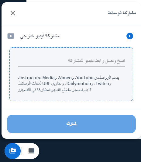 يستطيع المقدم مشاركة الشاشة بكل سهولة من اداه مشاركة الشاشة او من خلال المنطقة الإعلامية ( مشاركة الوسائط )