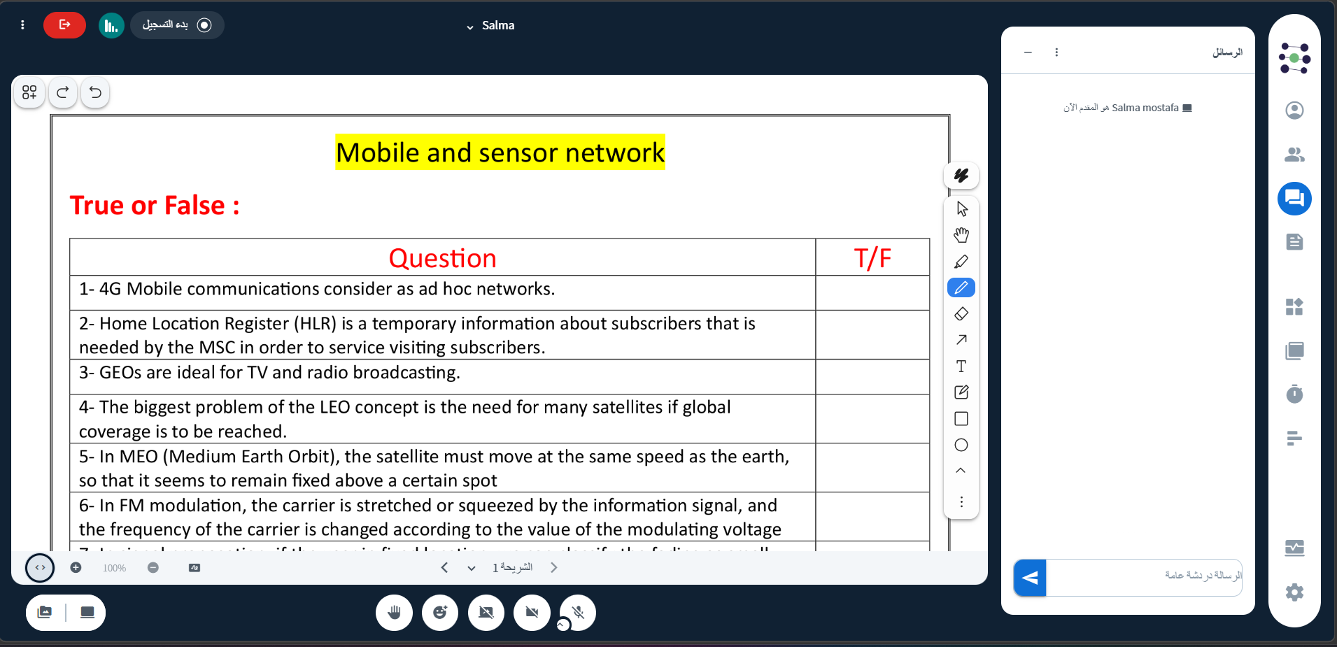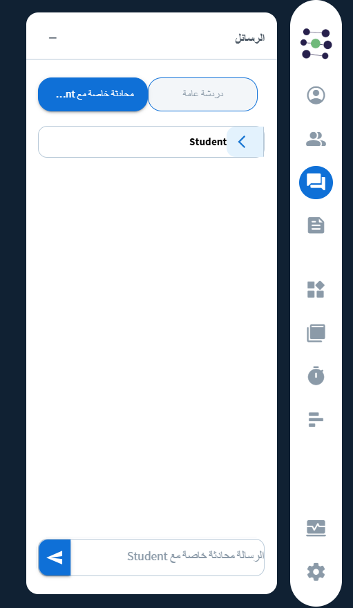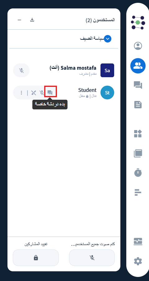 - دردشة خاصة بين المعلم والطالب، يمكن للمعلم فتحها عن طريق اختيار اسم الطالب من قائمة الحاضرين.