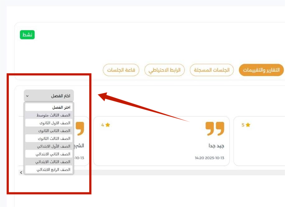 التقارير والتقييمات :يمكن للمعلم اختيار الصف لاستعراض تقييمات الطلاب حول جودة الشرح وأي معوقات تقنية واجهتهم أثناء الدخول.