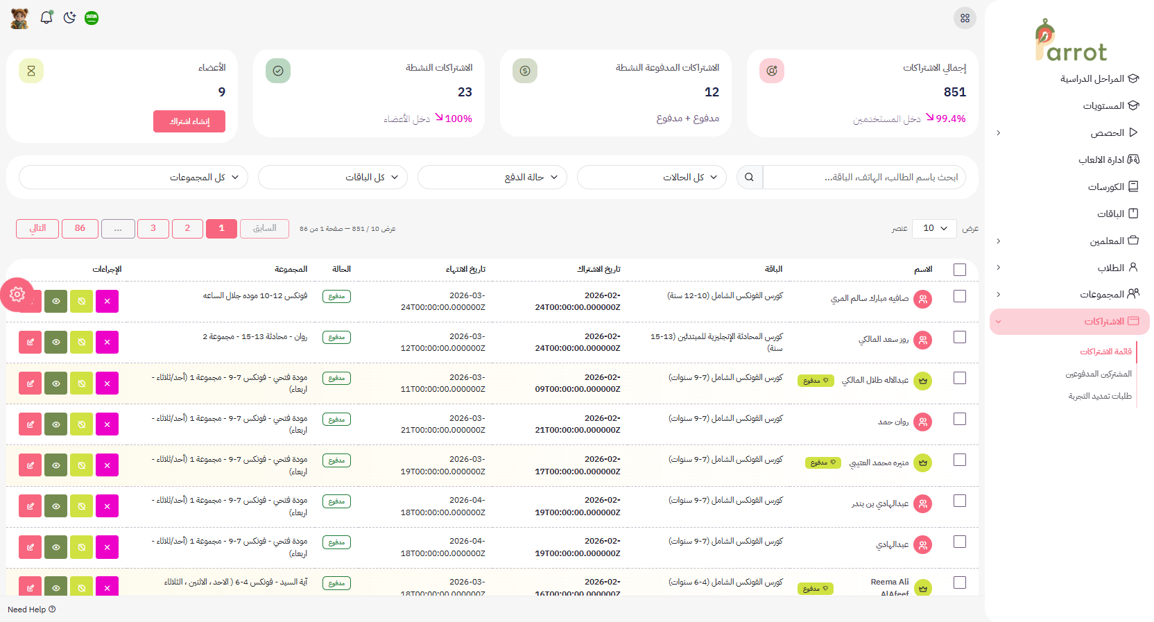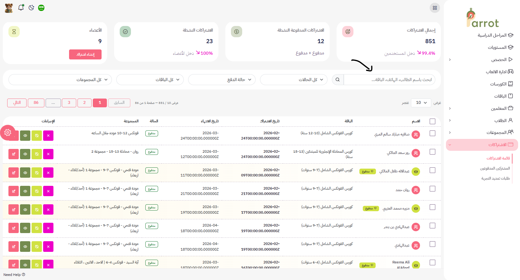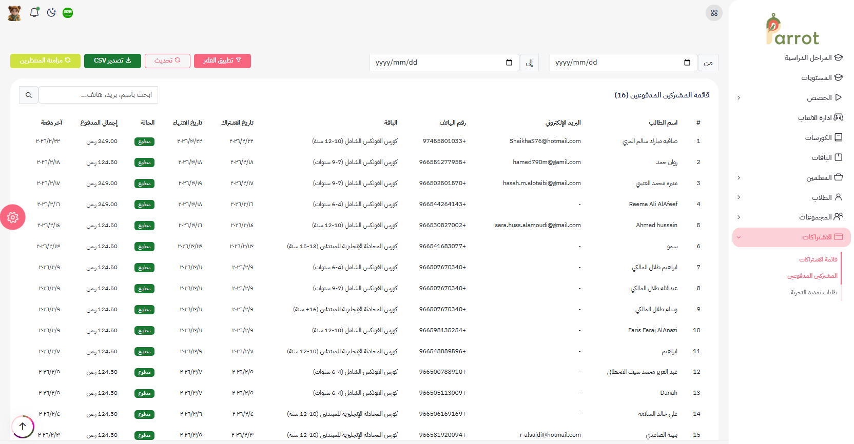 هنا يظهر جميع الطلاب المشتركين(اشتراك مدفوع).