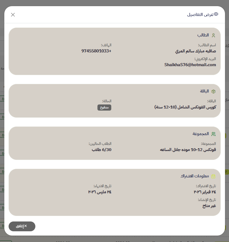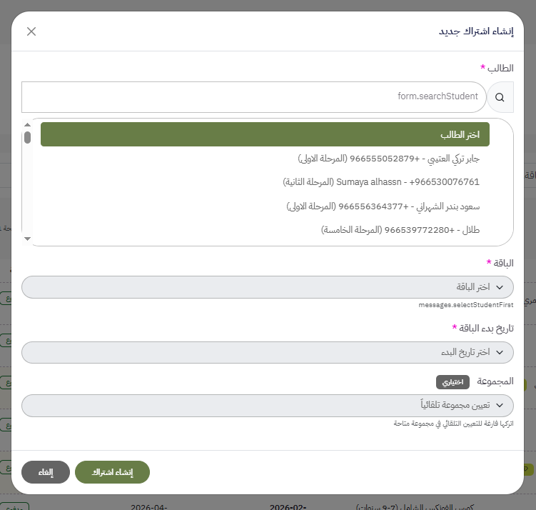 إضافة اشتراك ل طالب مشترك بالمنصة: