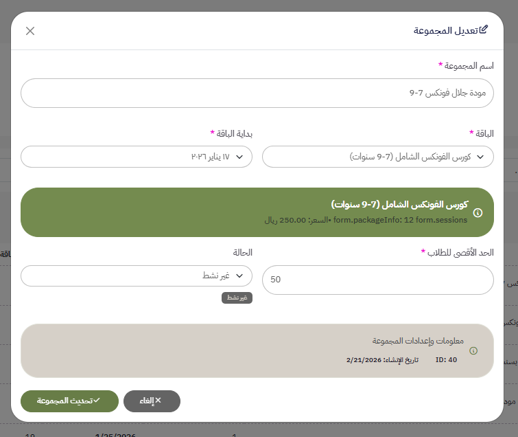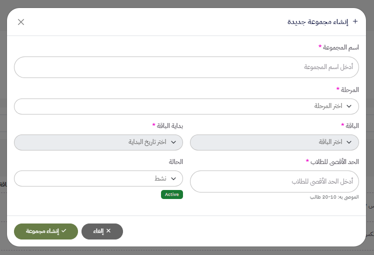 - الحد الاقصي للطلاب(اقصي عدد للطلاب يمكنه التسجيل بالمجموعة)