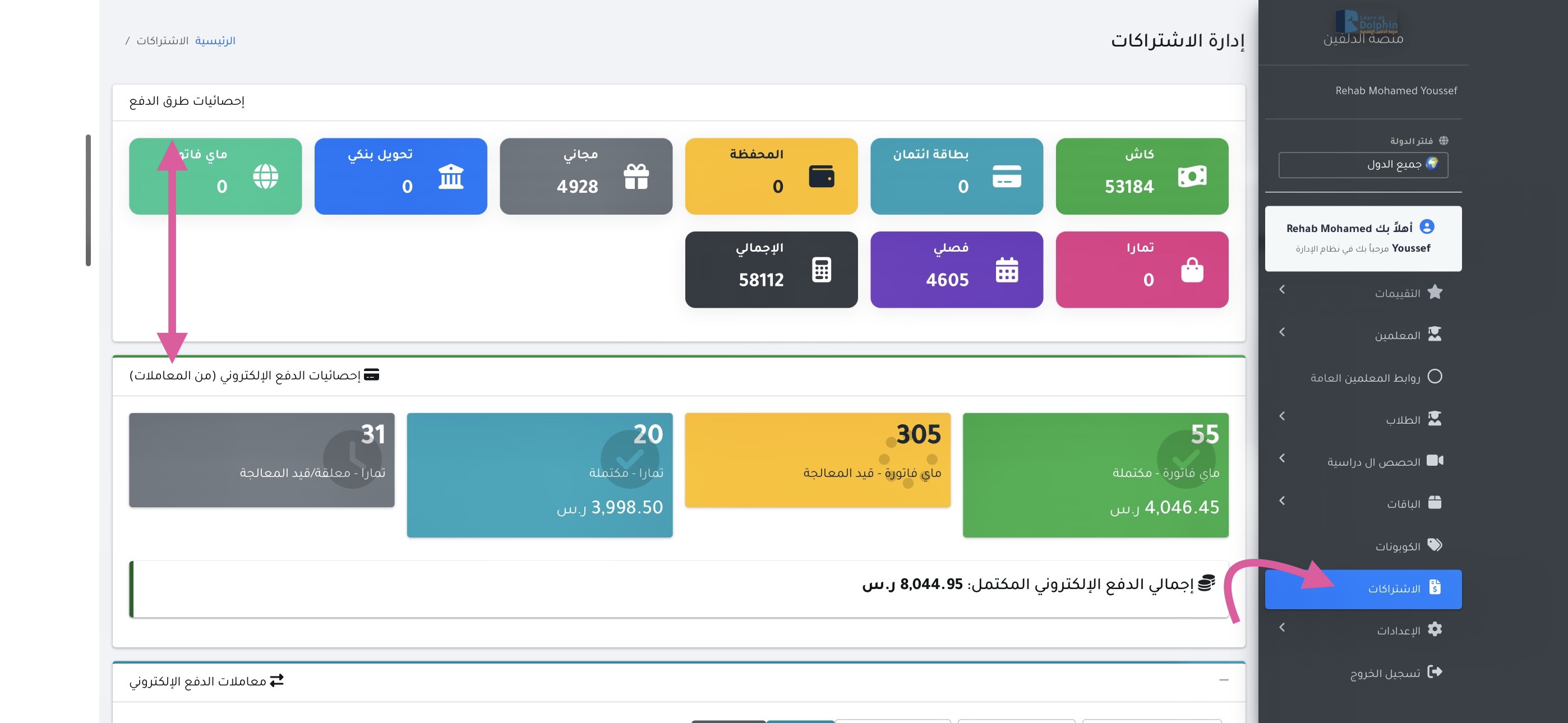 عند الدخول إلى قسم معاملات الدفع الإلكتروني تظهر مجموعة من البيانات الخاصة بعمليات الدفع، وتشمل ما يلي: