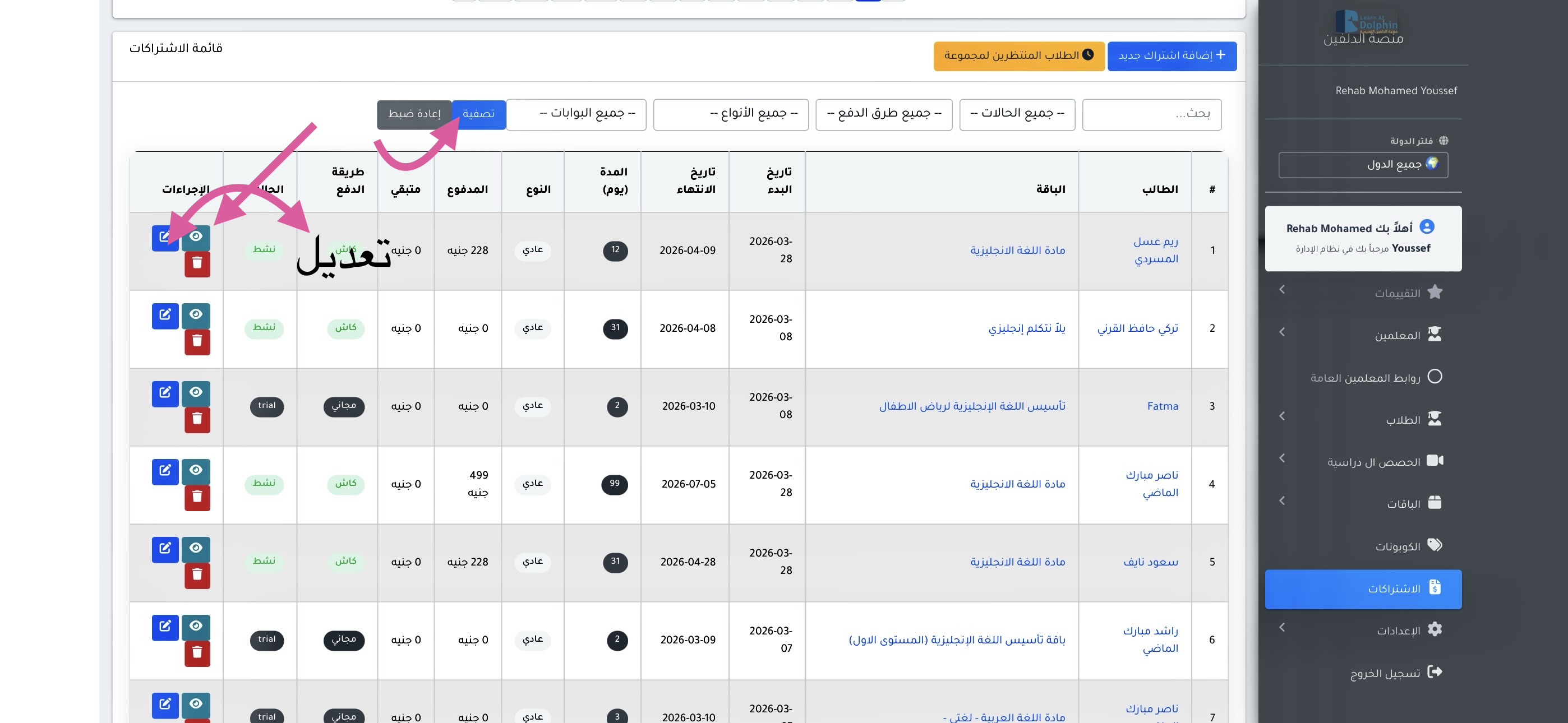 عند الدخول إلى قائمة الاشتراكات، تظهر جميع البيانات الخاصة باشتراكات الطلاب، وتشمل ما يلي: