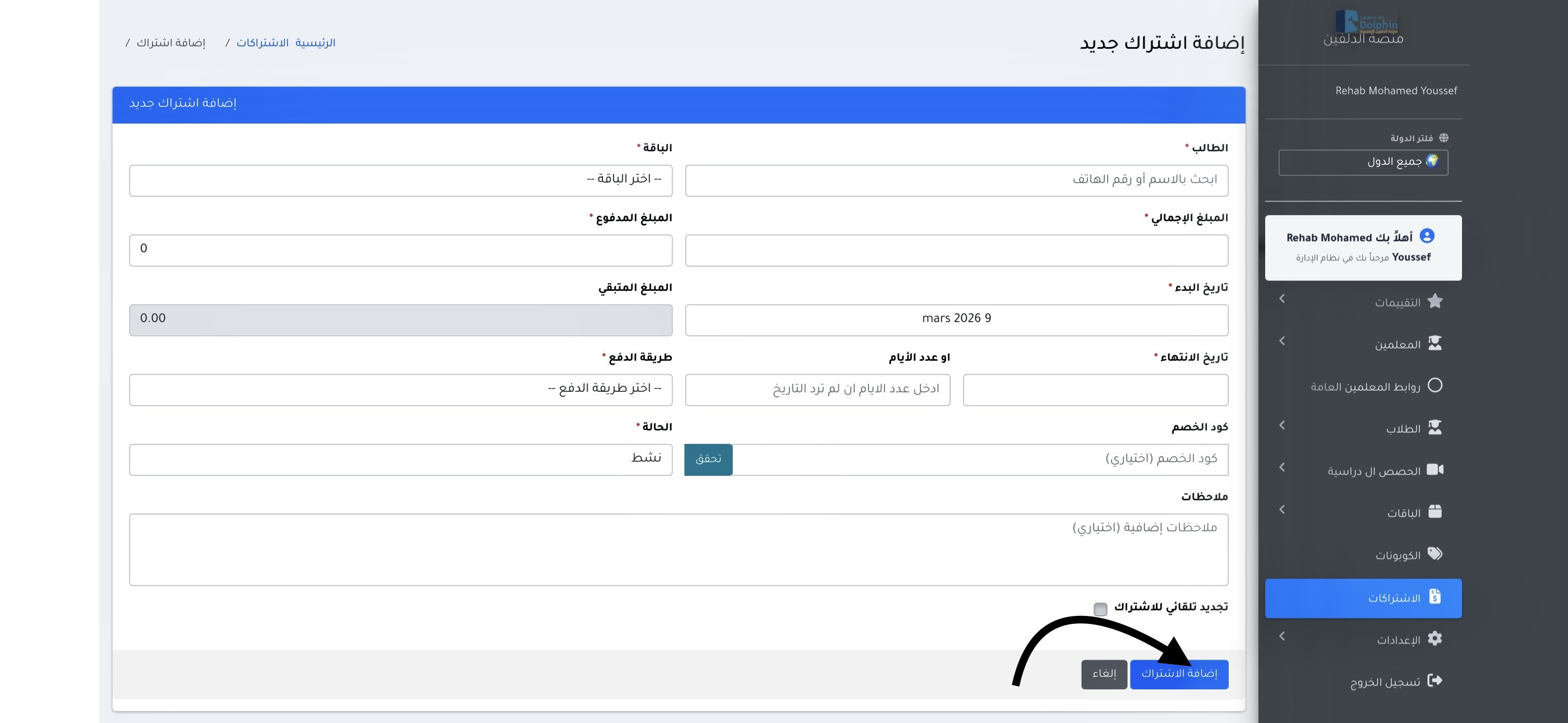 يمكن من خلال هذه القائمة إضافة اشتراك جديد للطلاب.