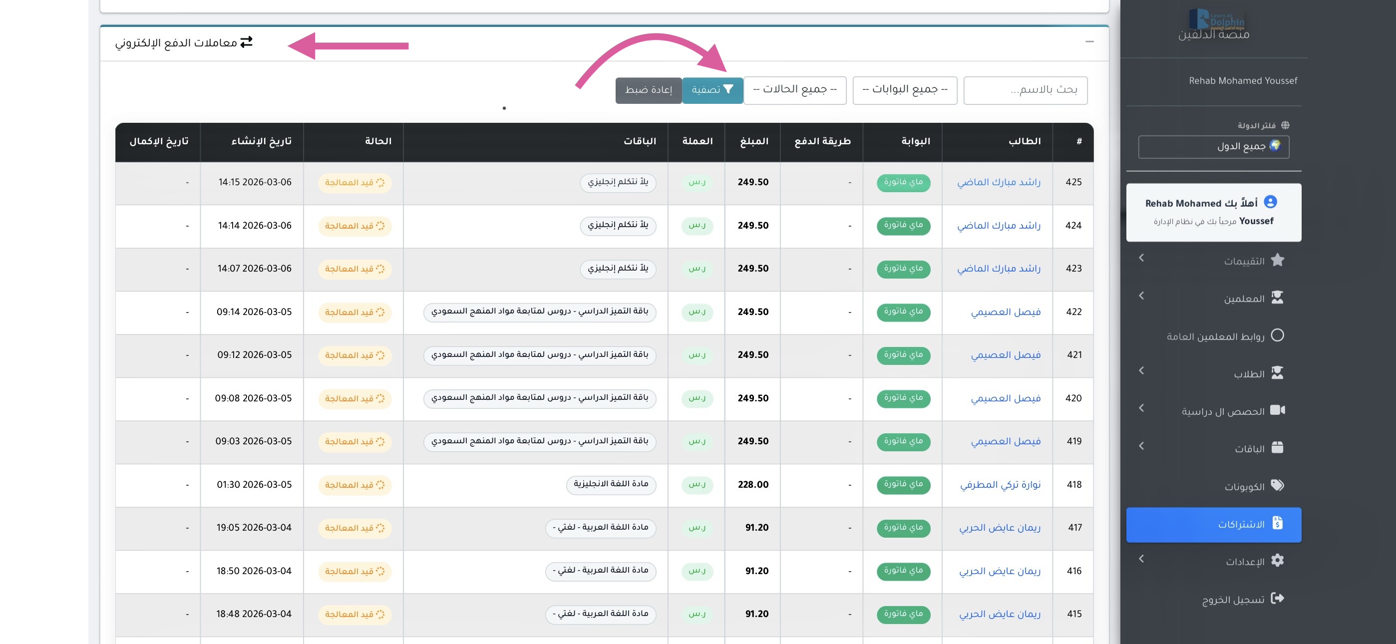 • الحالات: (جميع الحالات، مكتملة، قيد المعالجة، معلق، فشل، ملغي)