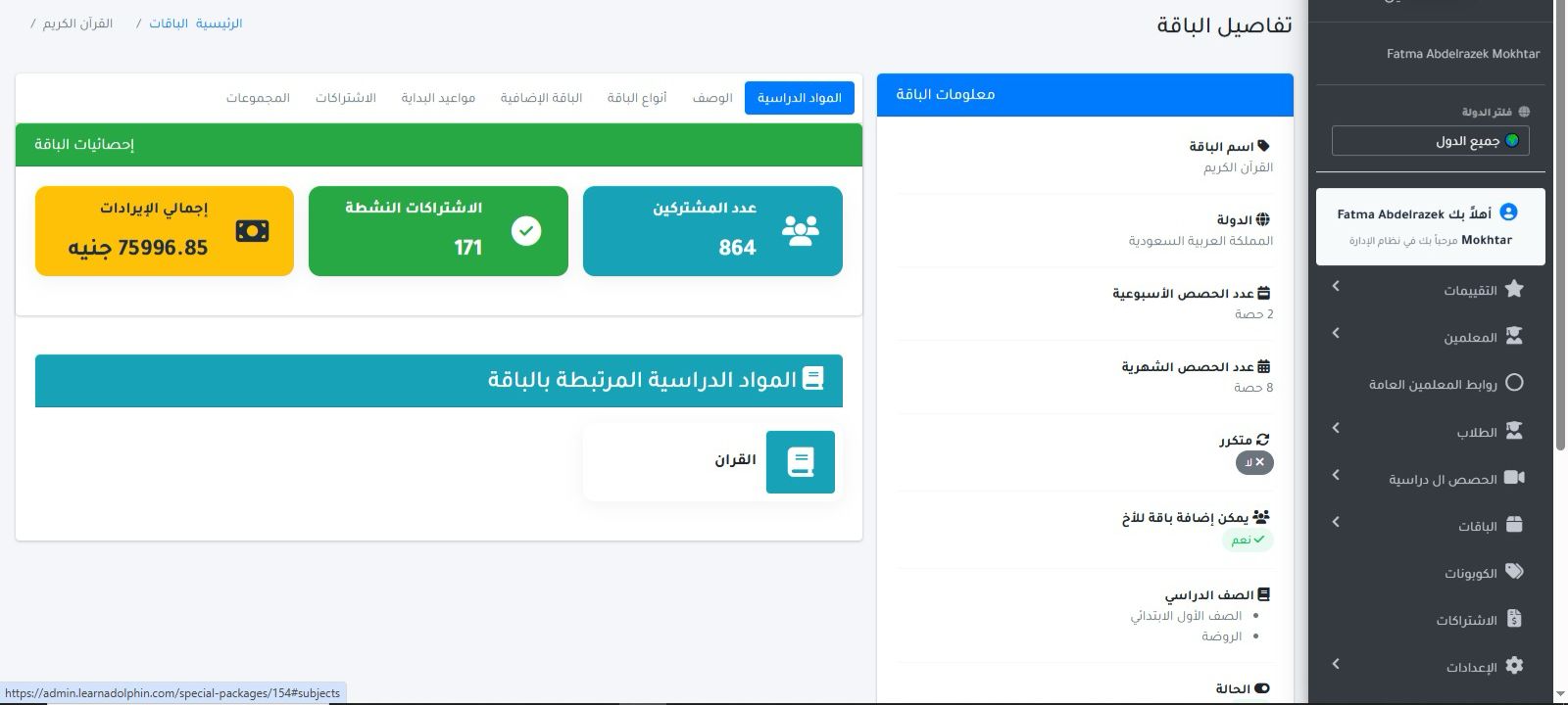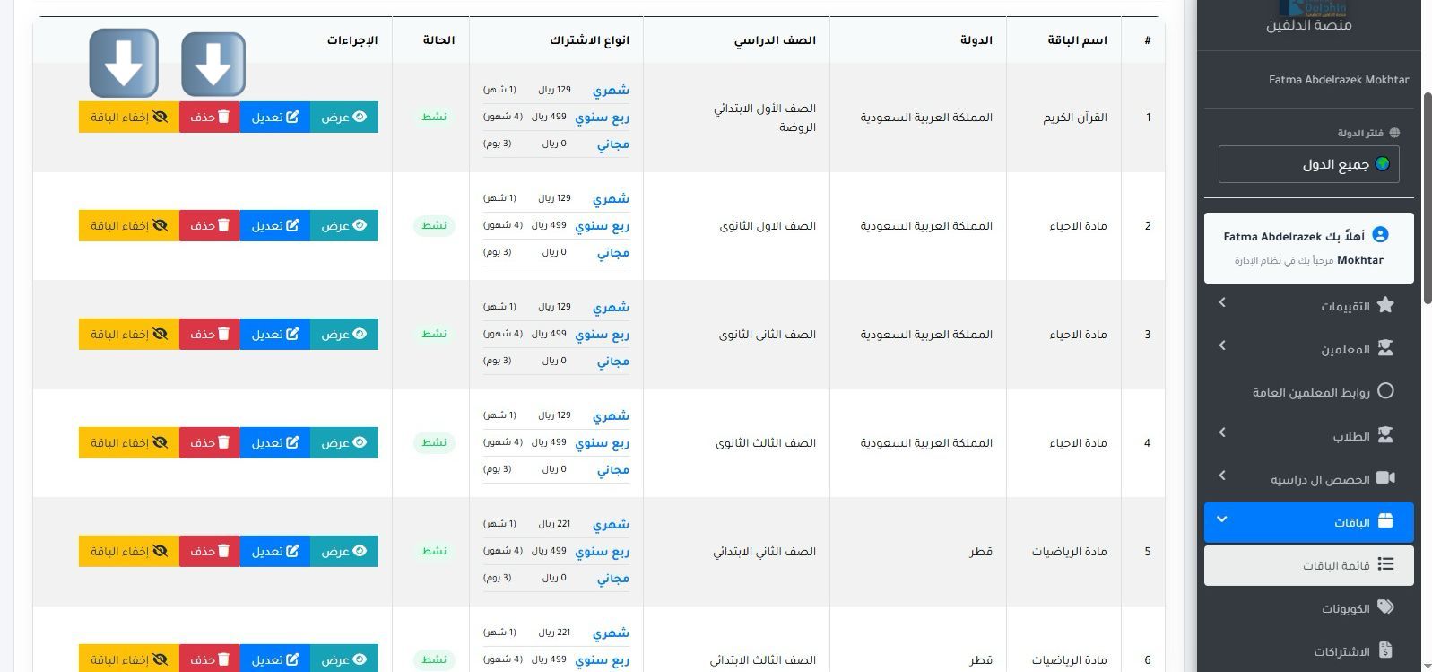 اولا عند الدخول إلى قائمة الباقات، تظهر تفاصيل جميع البيانات الخاصة باشتراكات الباقات لجميع مواد منصه الدولفين التعلميه ،ايضا تنقسم أنواع الاشتراكات في الباقات داخل منصة الدلفين التعليمية إلى عدة أنواع،ويختلف سعر كل نوع من هذه الاشتراكات حسب المادة التعليمية المقدمة داخل الباقة، وكذلك حسب الدولة التي ينتمي إليها المشترك.