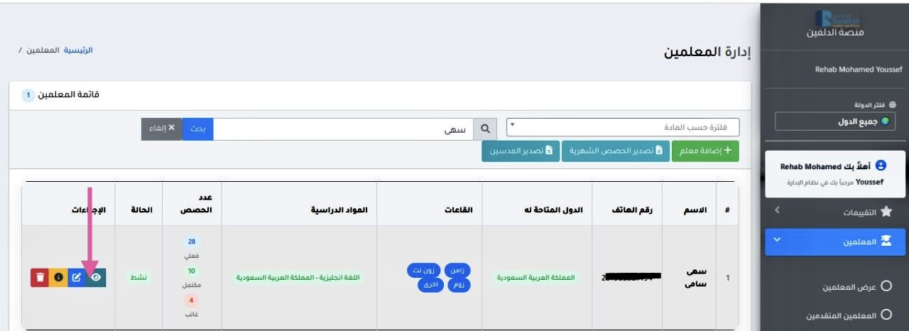 من خلال لوحة التحكم نضغط علي "المعلمين "و نختار "عرض المعلمين " و من خلال هذة الصفحة يمكن القيام بعدة إجراءات ، منها :