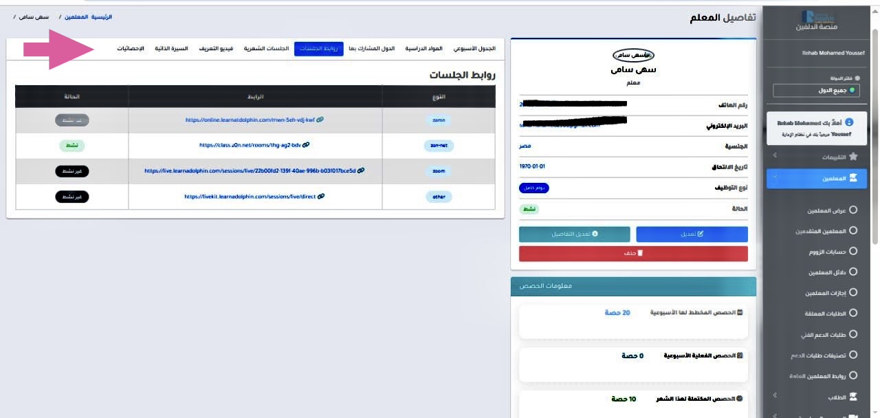 يمكن تعديل المعلومات الخاصة بالمعلم وإدارة الجلسات كما يلي: