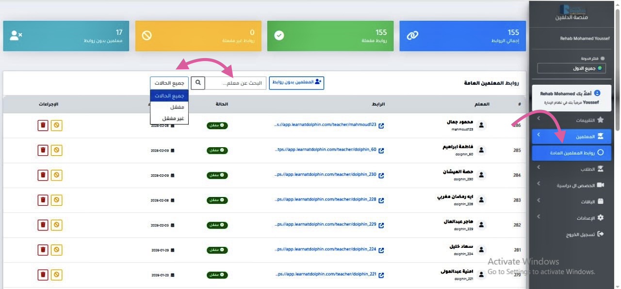 • استخدام شريط البحث للبحث عن اسم المعلم ومعرفة حالة تفعيل رابط حسابه