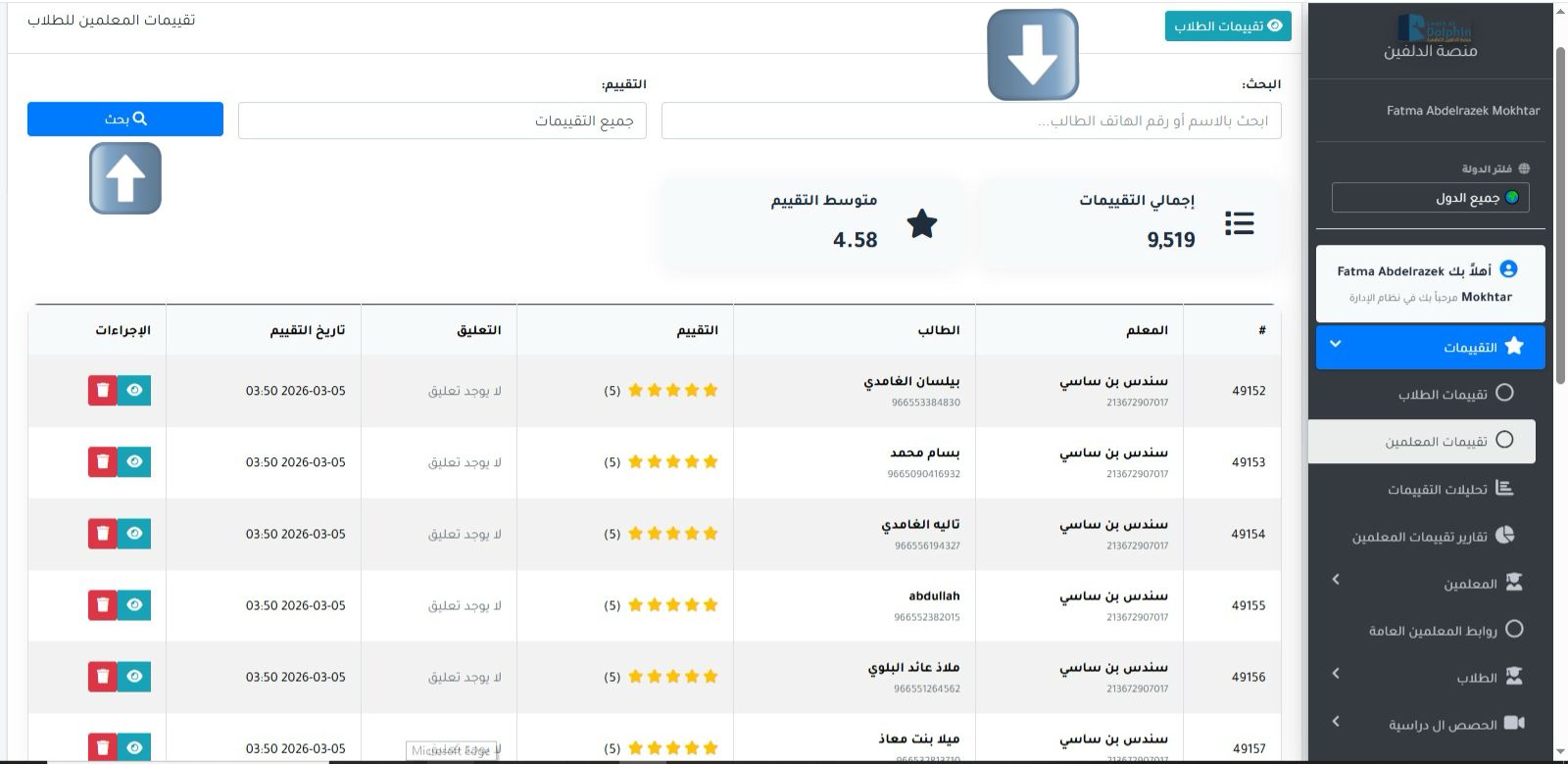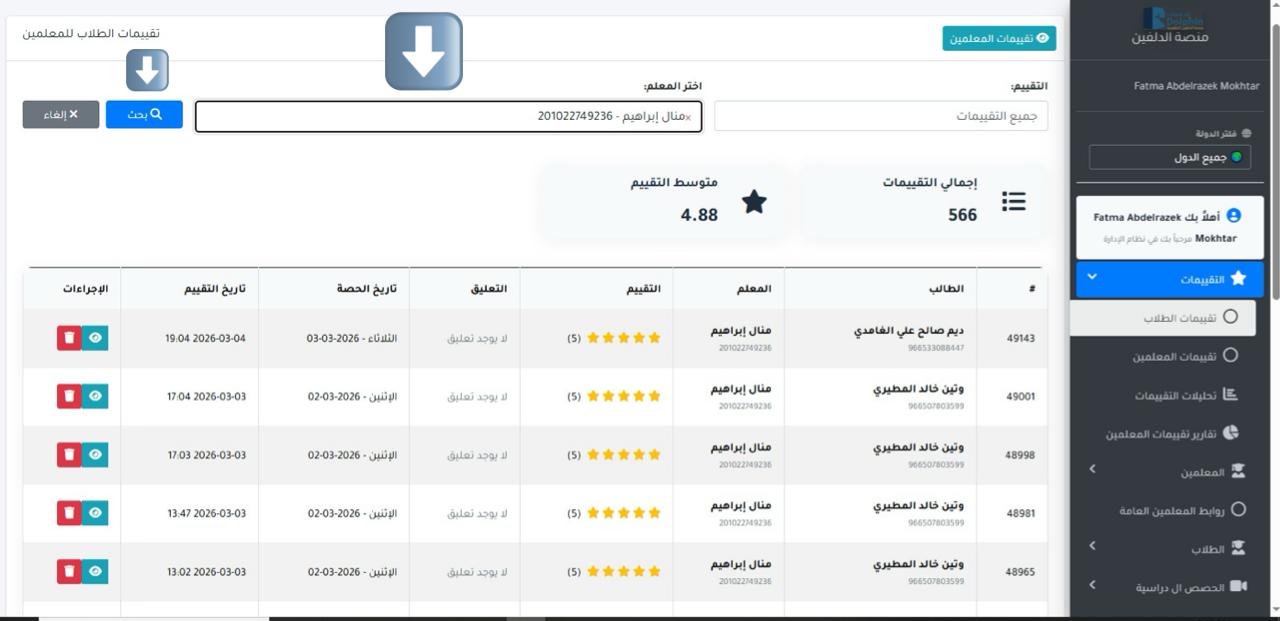 البحث عن التقييمات: في حال معرفه تقيمات كل معلم من خلال الطلاب
